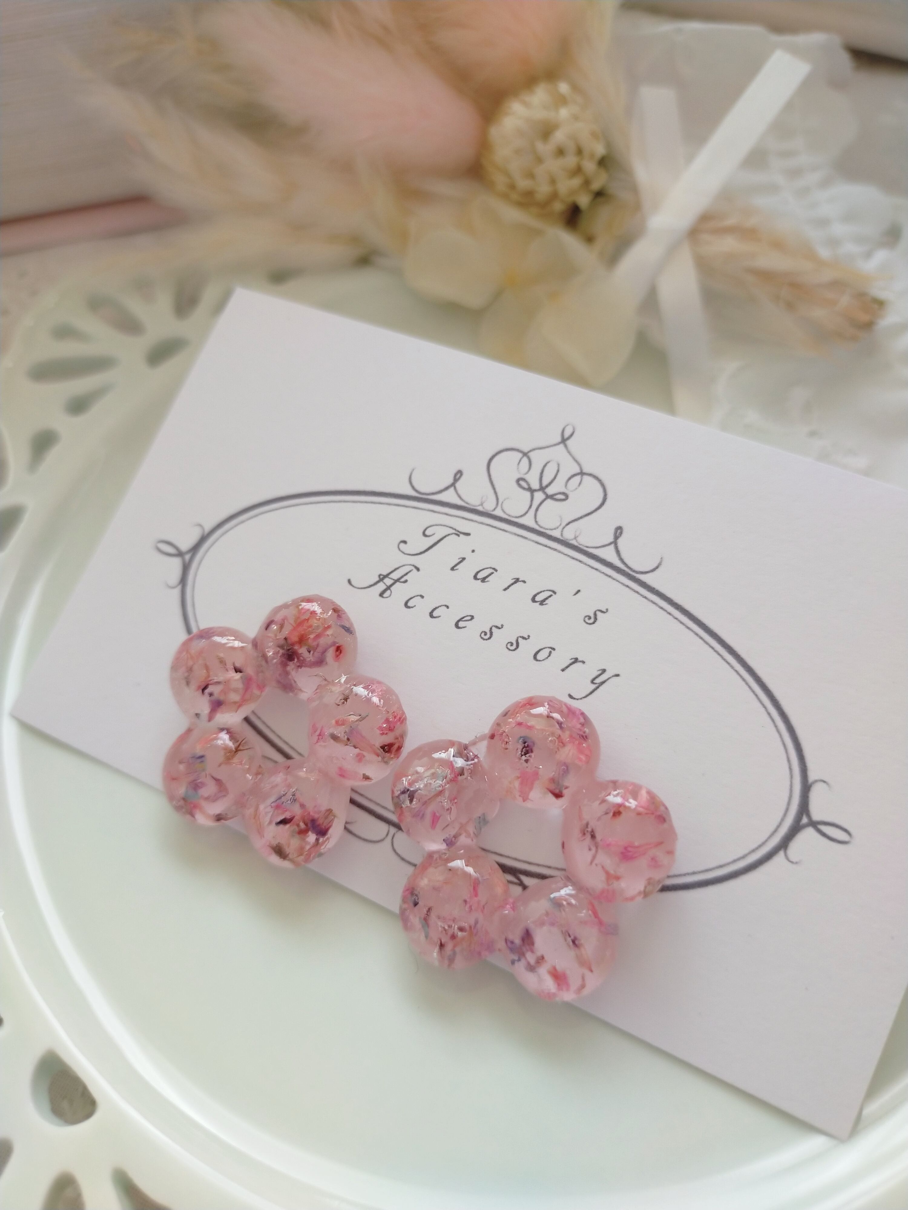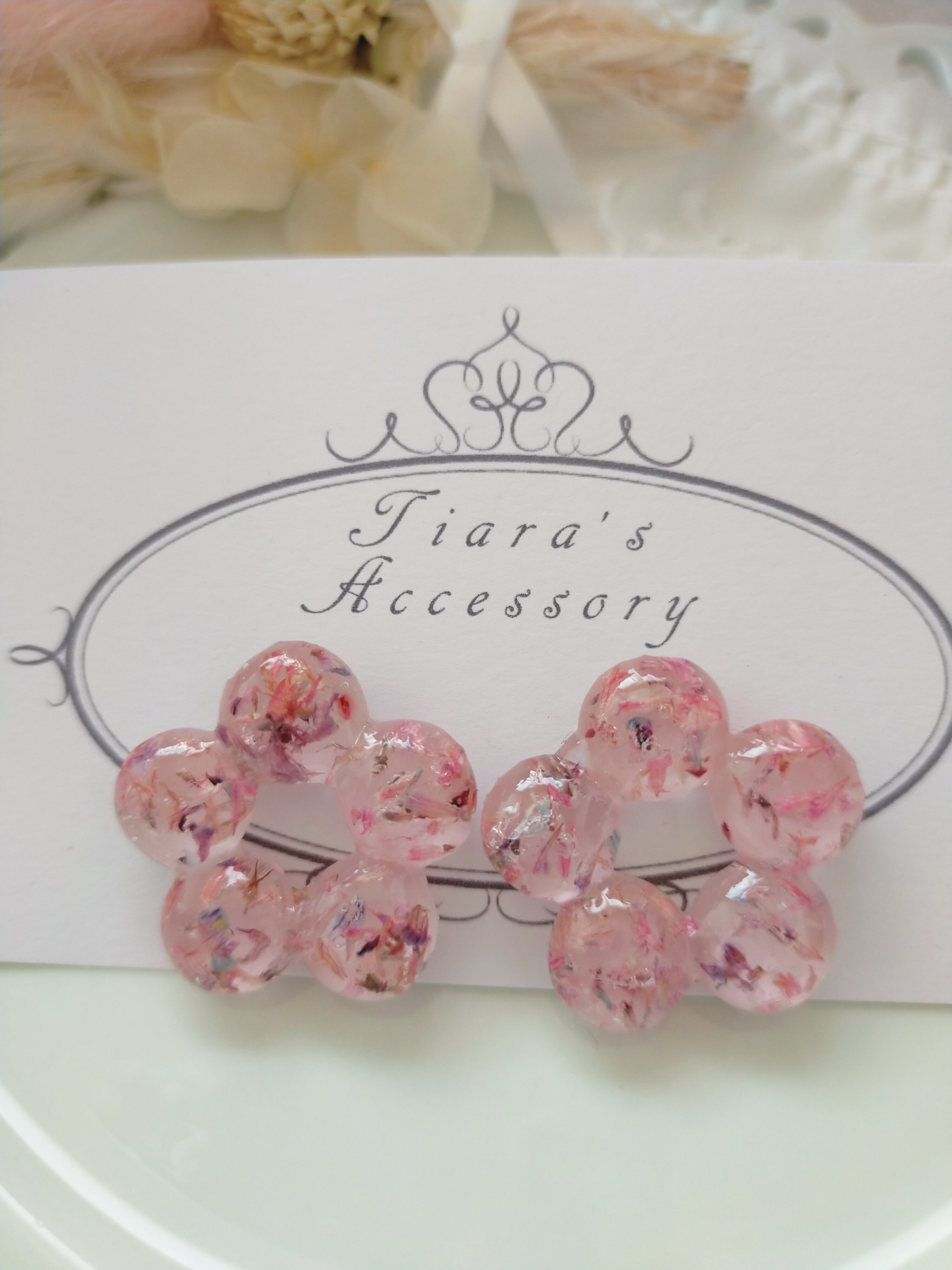 ほんのり優しい色合いが可愛い、ぷっくりお花のピアス。小さな花びらを入れました。